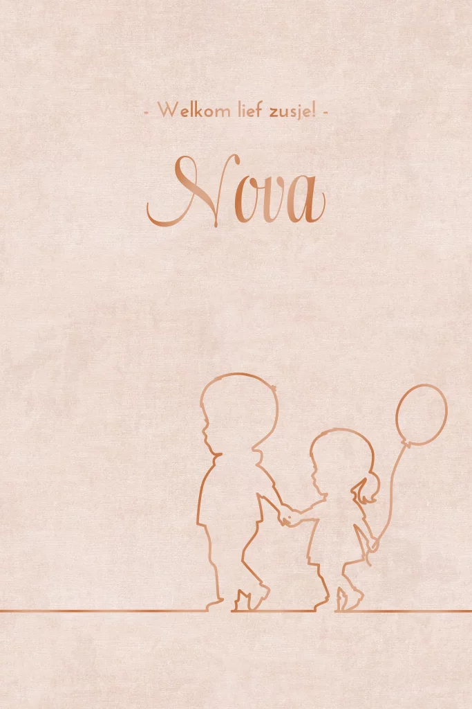 Geboortekaartje met silhouetten in lijnen van een meisje met haar grote broer. De twee lopen hand in hand en het meisje heeft een ballon vast. Dit wordt allemaal gedrukt in echt hoogglans, ontzettend uniek!