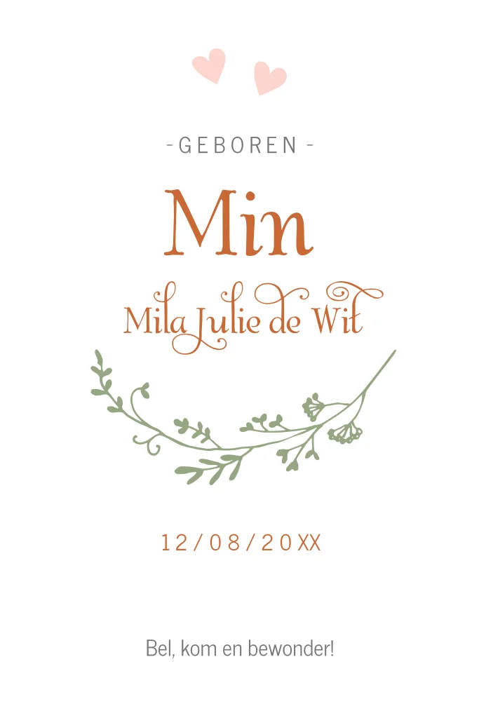 Schattig geboortekaartje met hoogglans voor je pasgeboren dochter. De bloemenkrans op een groene achtergrond met licht roze stipjes maakt dit echt een lief en romantisch geboortekaartje!
