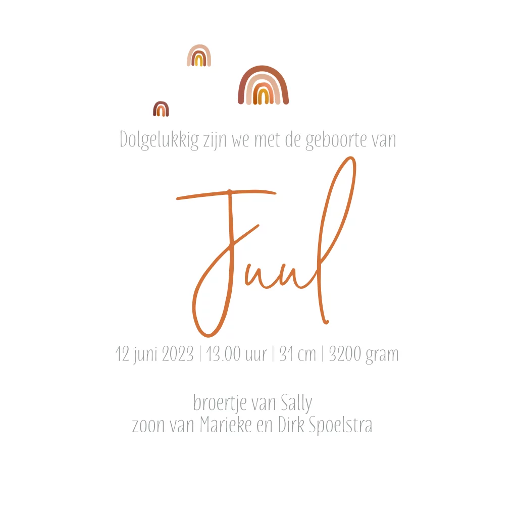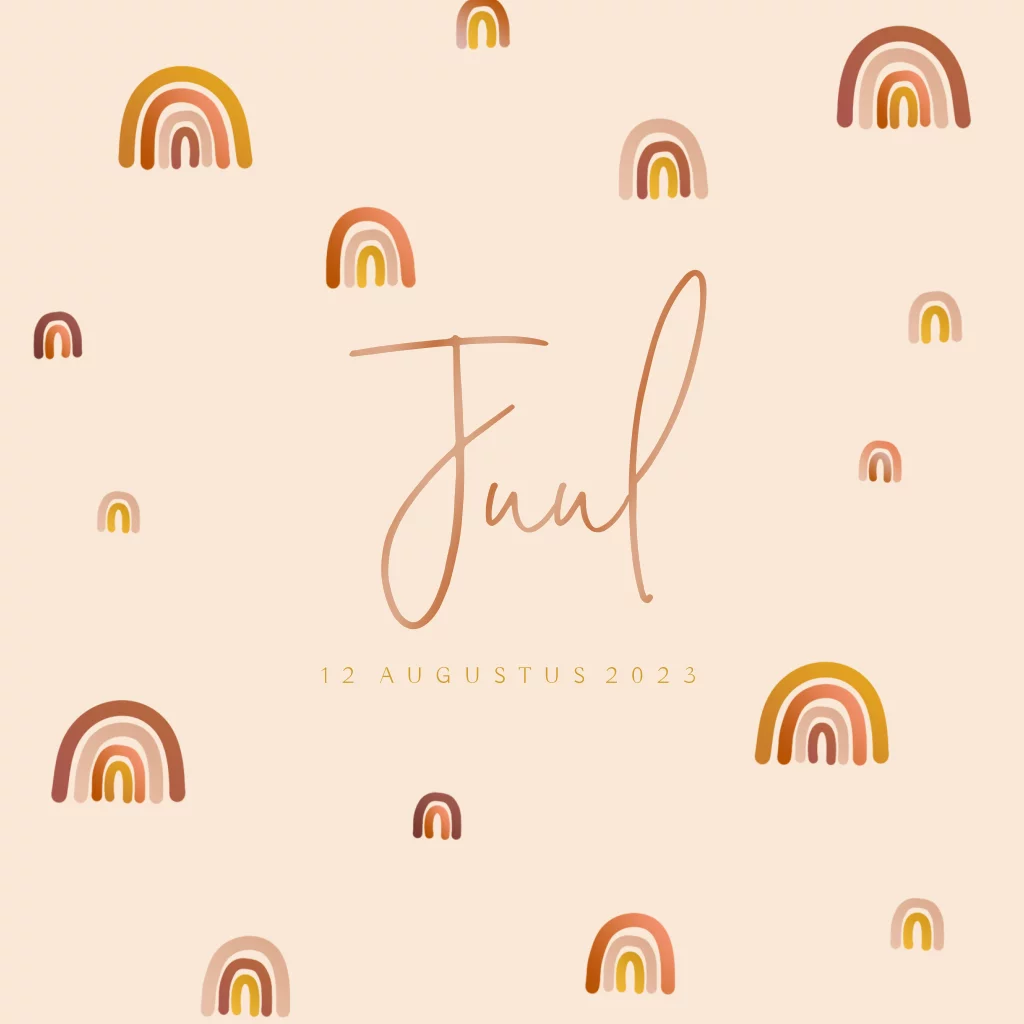 Trendy geboortekaartje voor je dochtertje met hoogglans en regenbogen in warme trendkleuren.
