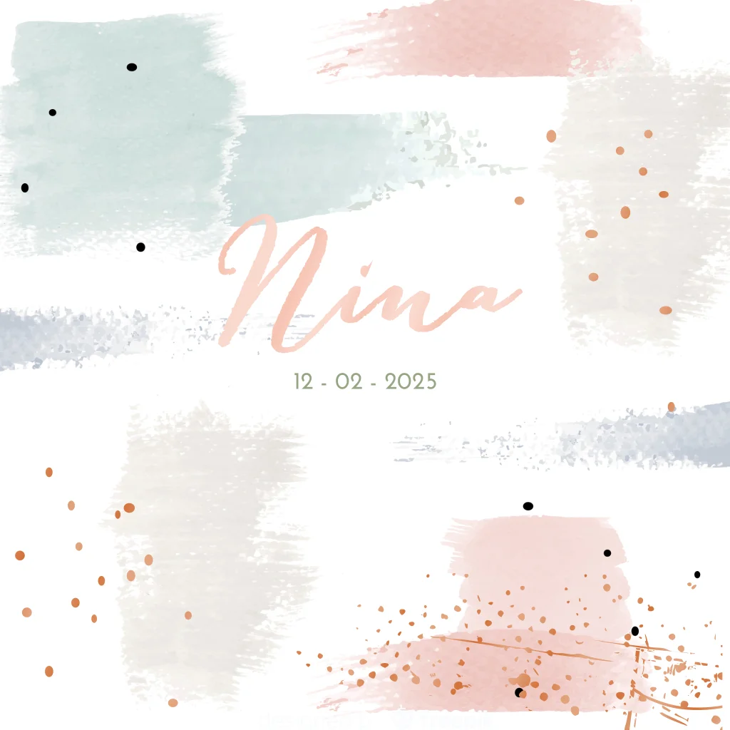 Hippe geboortekaart als geboorteaankondiging van je dochtertje met stoere aquarel verfstrepen in roze, blauw en grijs. De details in hoogglans maken dit echt een uniek geboortekaartje!