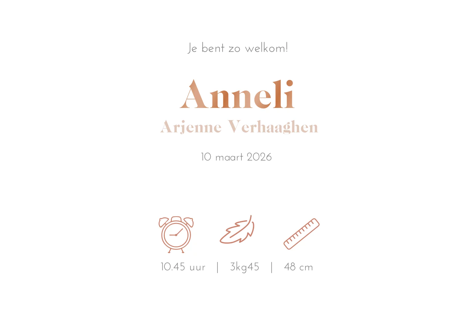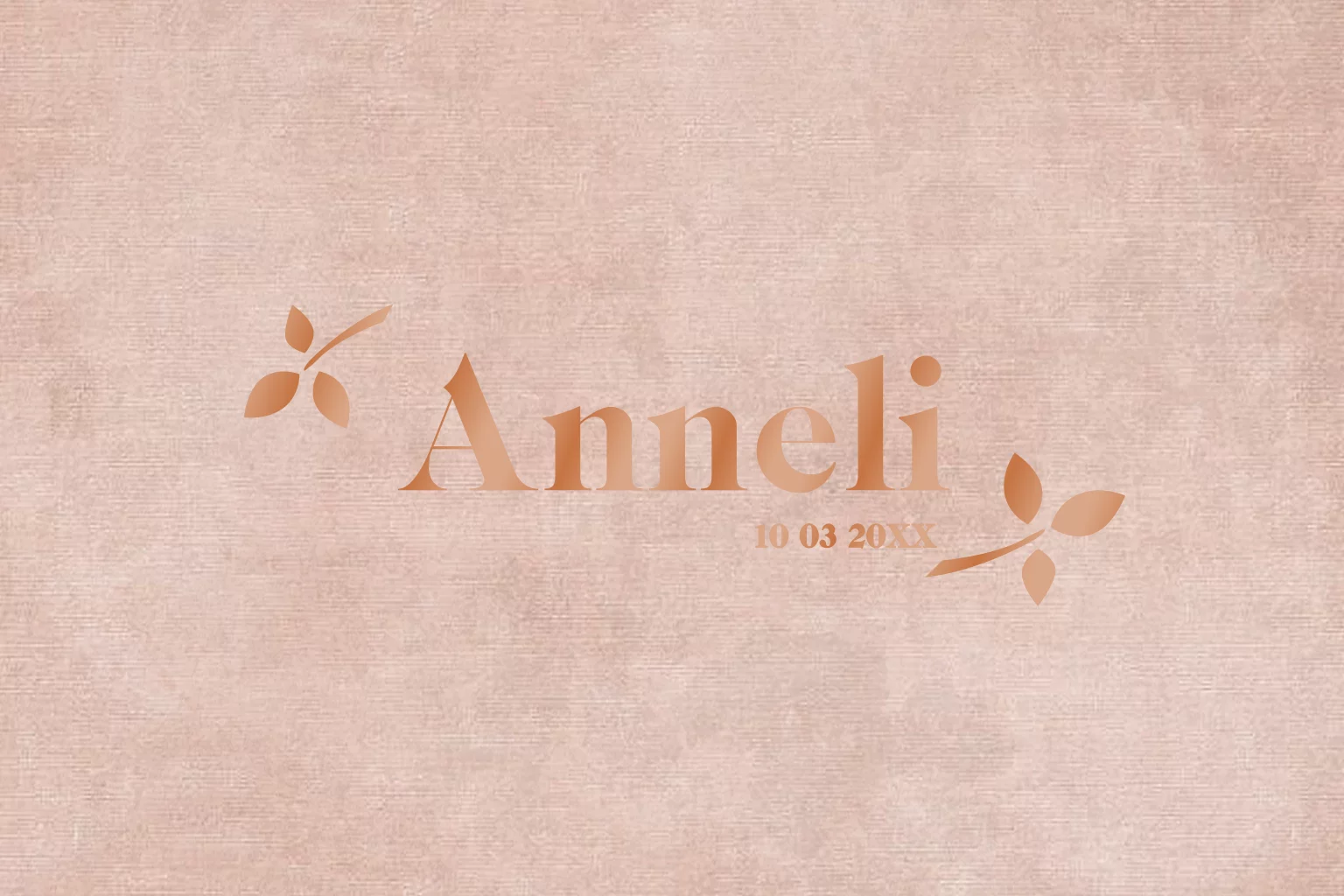 Trendy geboortekaart met de naam van je dochter en kleine takjes in hoogglans op een roze velvet-look achtergrond. De teksten en foliekleur kun je naar wens aanpassen in de online editor.