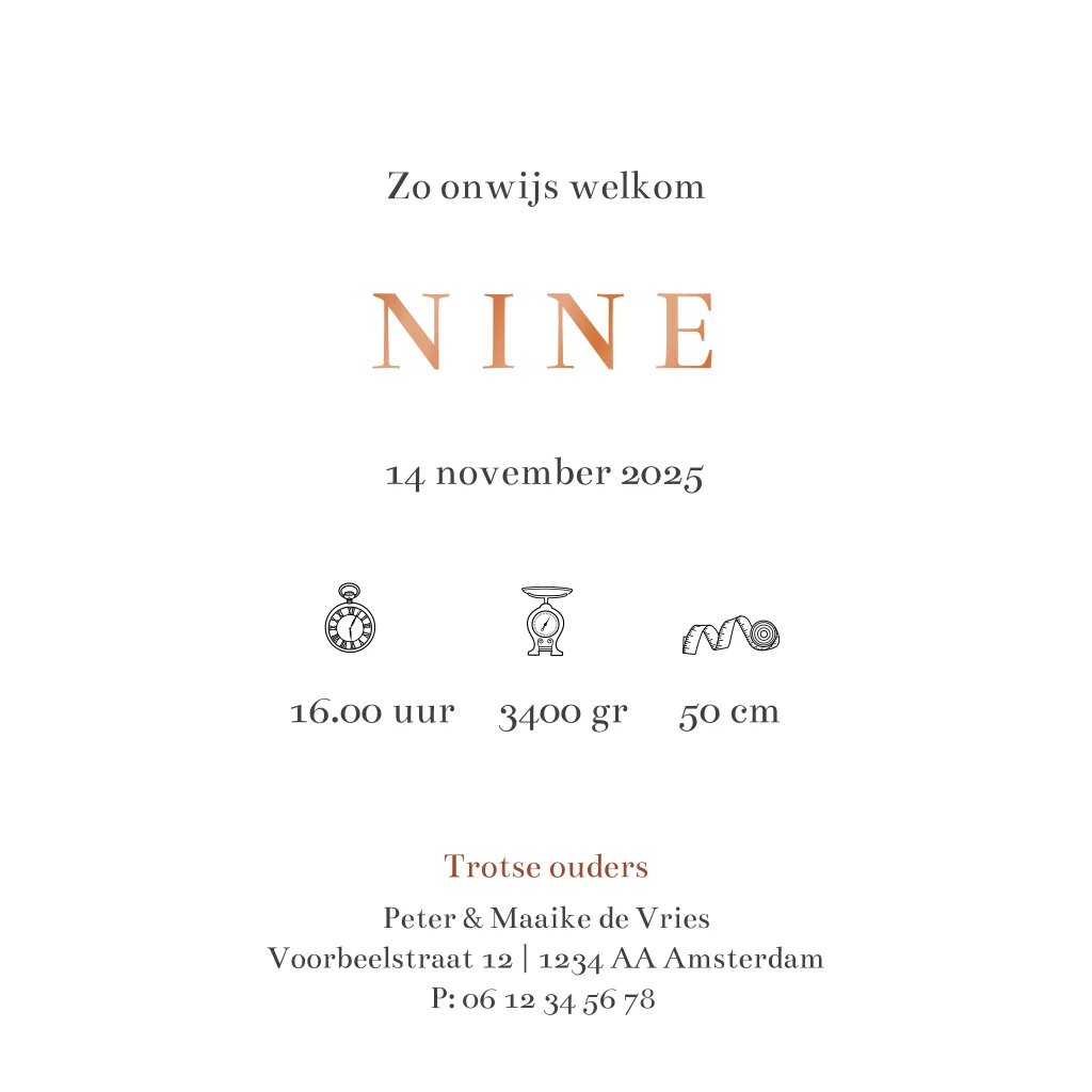 Hip en minimalistisch geboortekaartje voor de geboorte van je dochtertje met een trendy hoogglans takje. Dit kaartje is ook leuk voor een jongen! Verander de kleuren, teksten en maak een unieke geboortekaart!