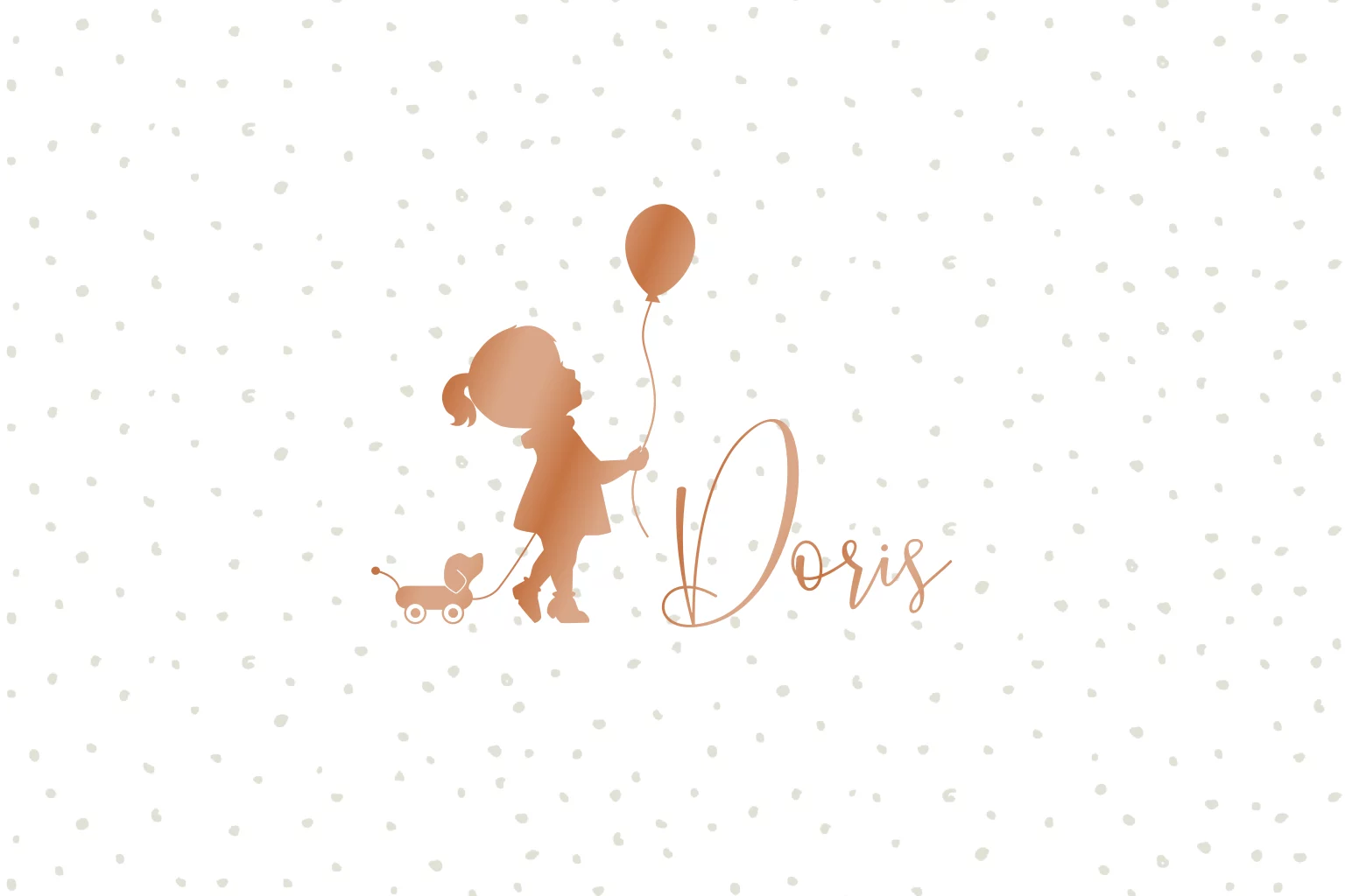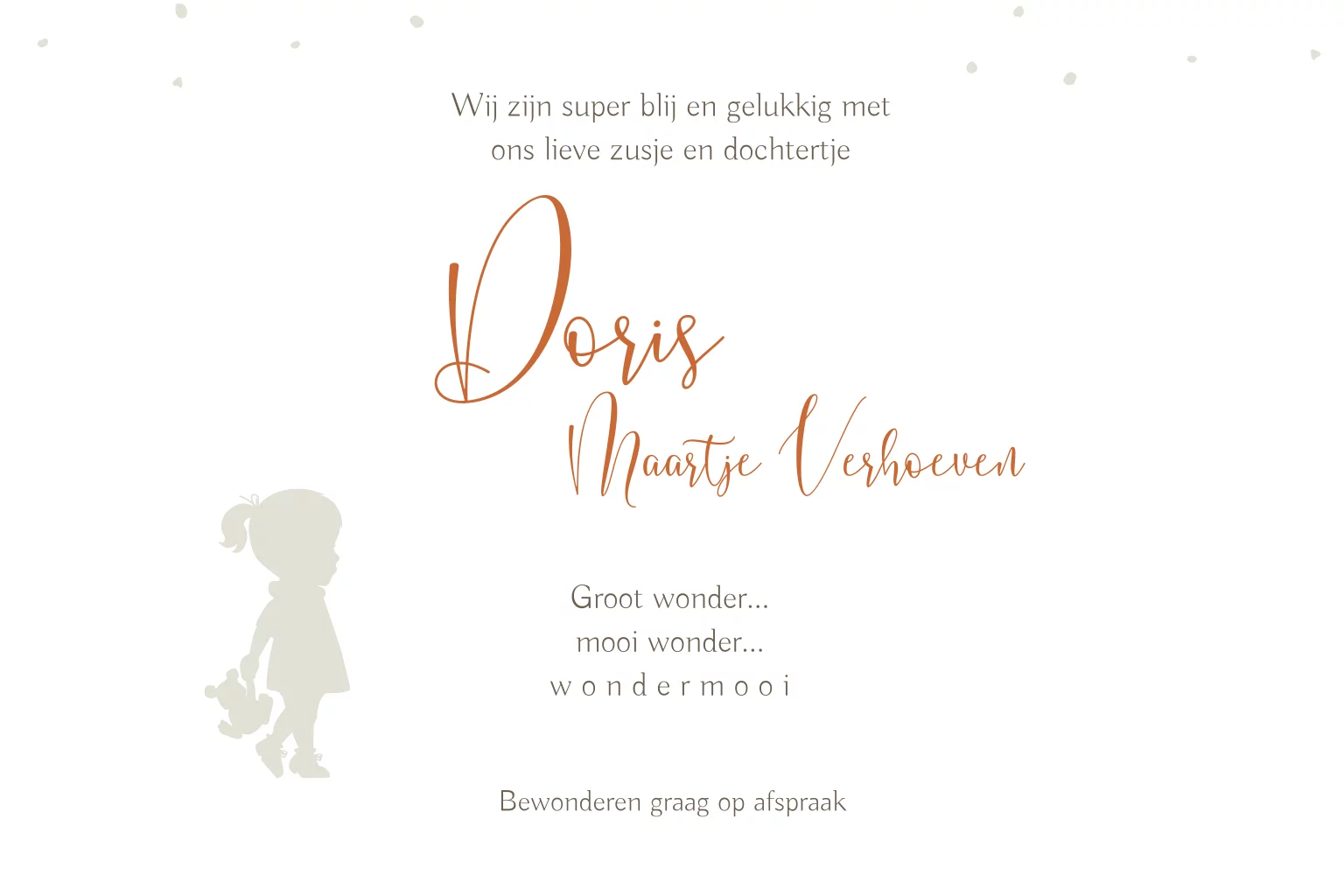 Lief geboortekaartje voor je pasgeboren dochtertje met een schattig silhouet van een meisje met haar speelgoed hondje op een stipjes achtergrond.