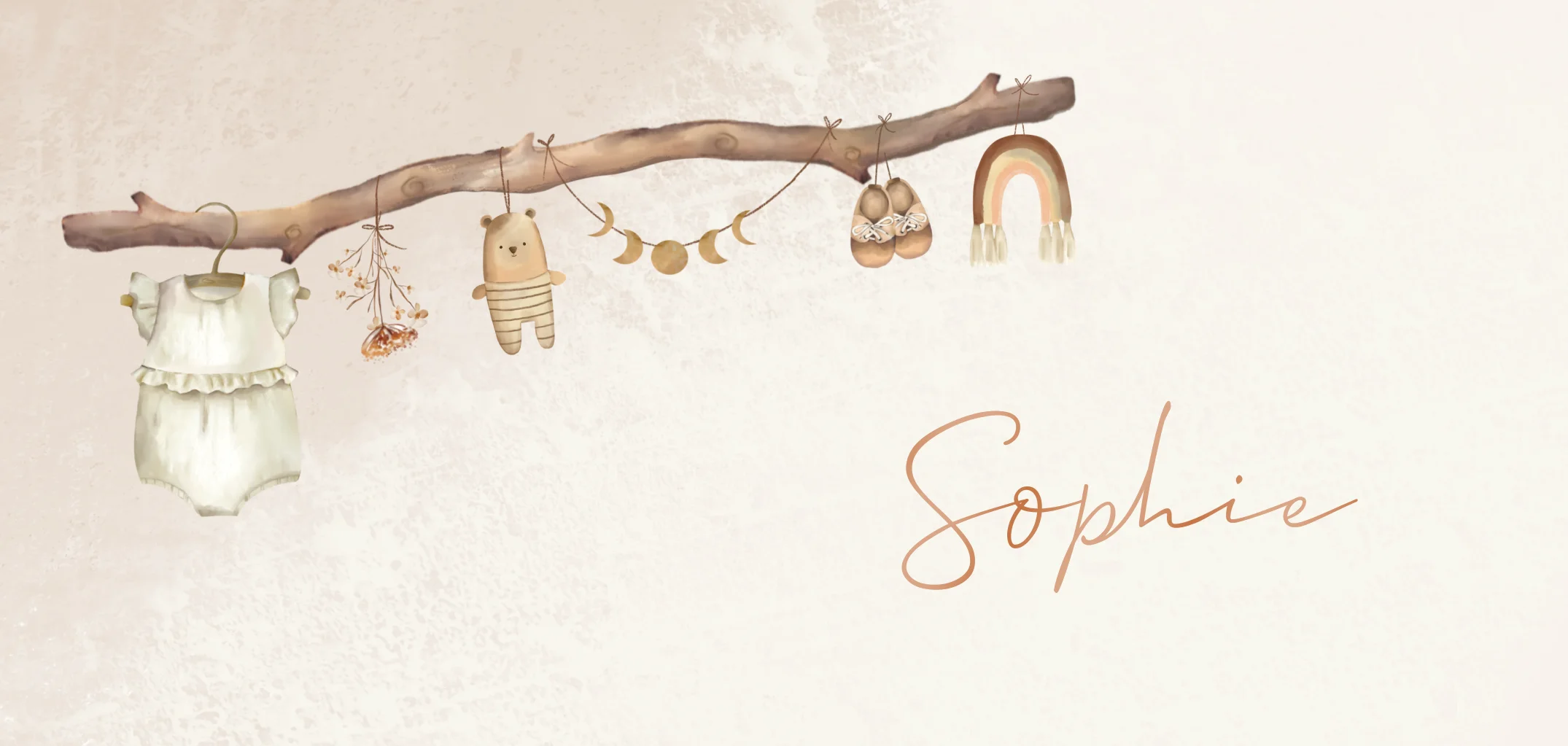 Een lief geboortekaartje voor de geboorte van jullie dochtertje. Op dit kaartje staat een grote tak met daaraan verschillende babyspullen die echt passen bij jullie dochter. De naam van jullie dochtertje wordt in hoogglans gedrukt.