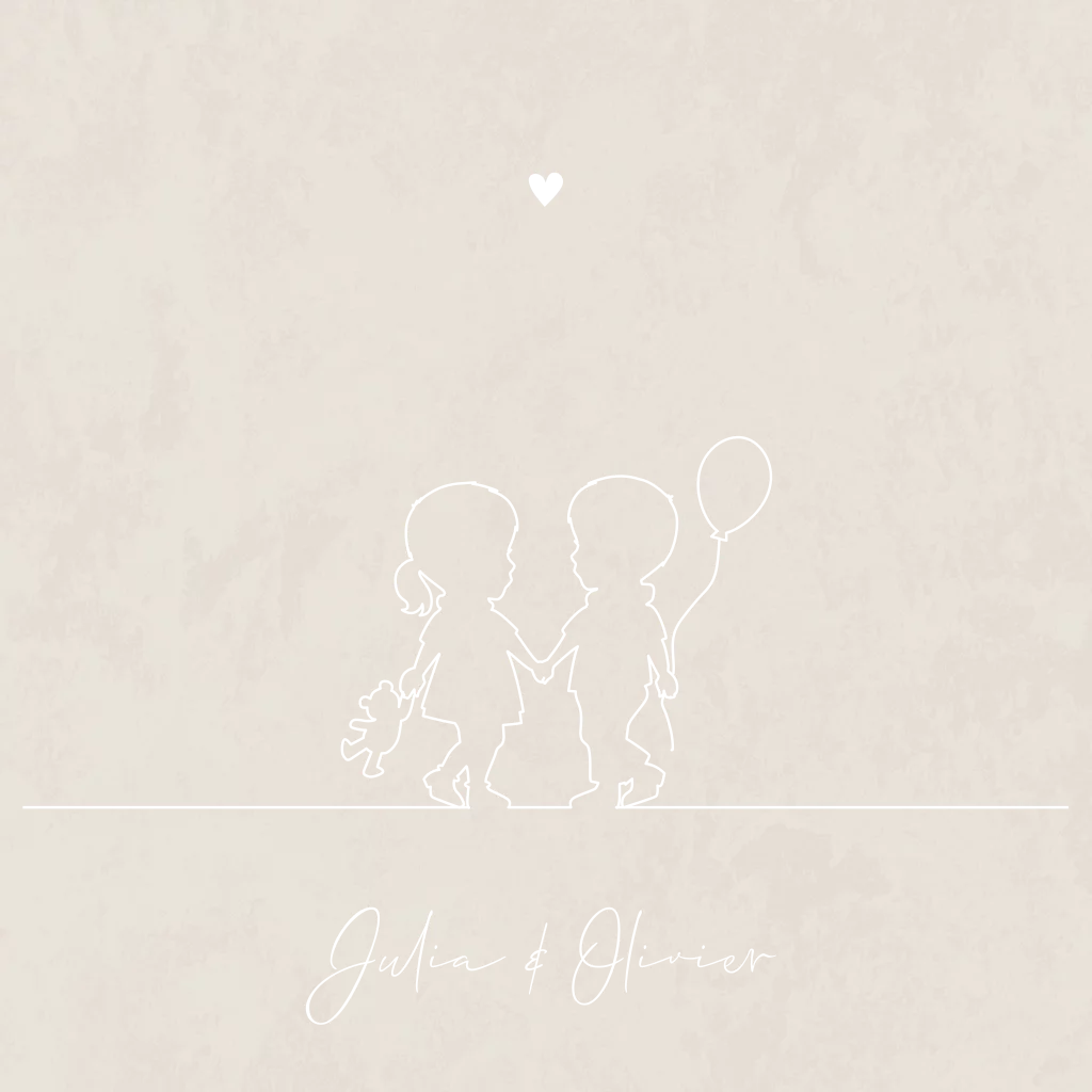 Een lief geboortekaartje voor een tweeling met roségoudfolie lijntekening van een jongen en een meisje. De tweeling loopt hand in hand. Op de achtergrond zie je een velvet-look achtergrond.