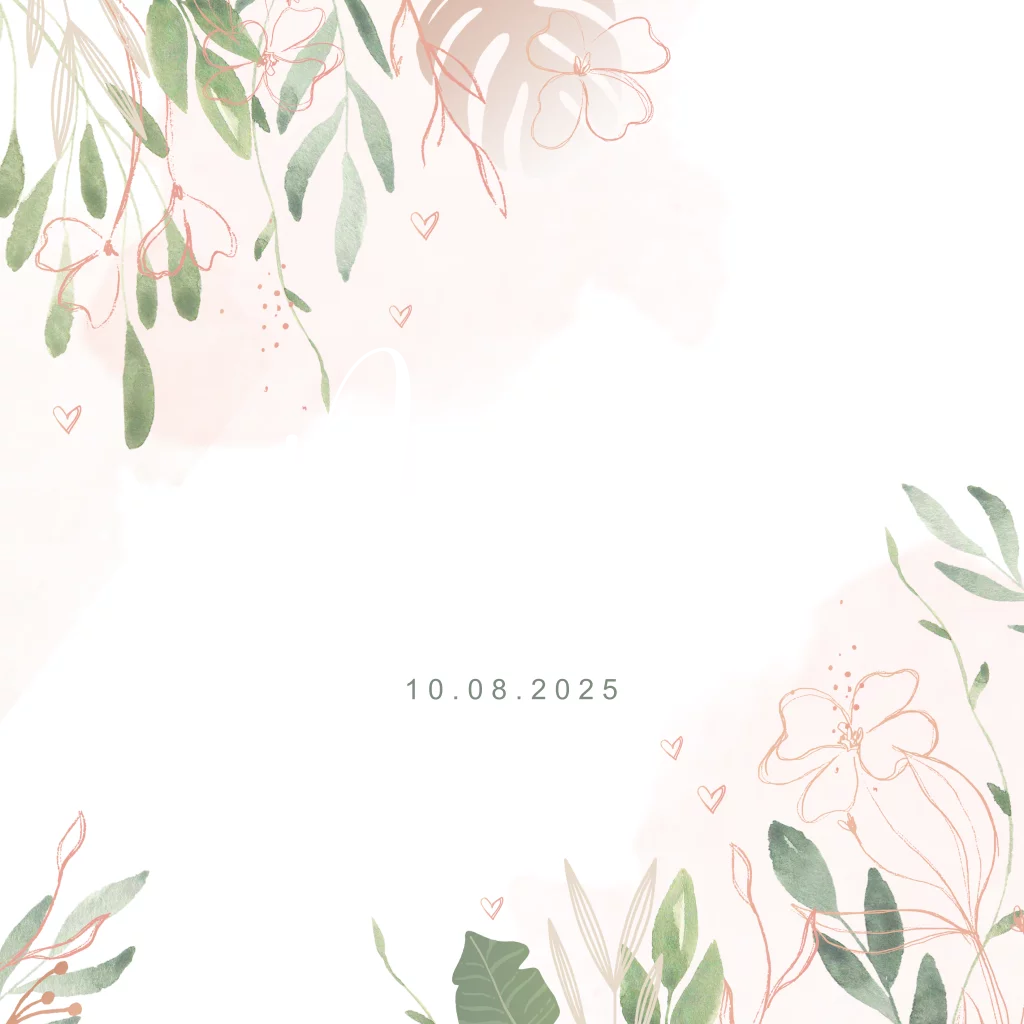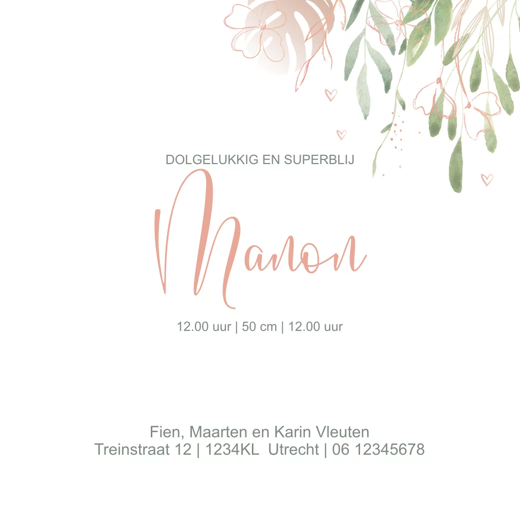 Stijlvol geboortekaartje voor je dochtertje met romantische bladertakjes en roze bloemetjes gecombineerd met de babynaam in roségoudfolie.