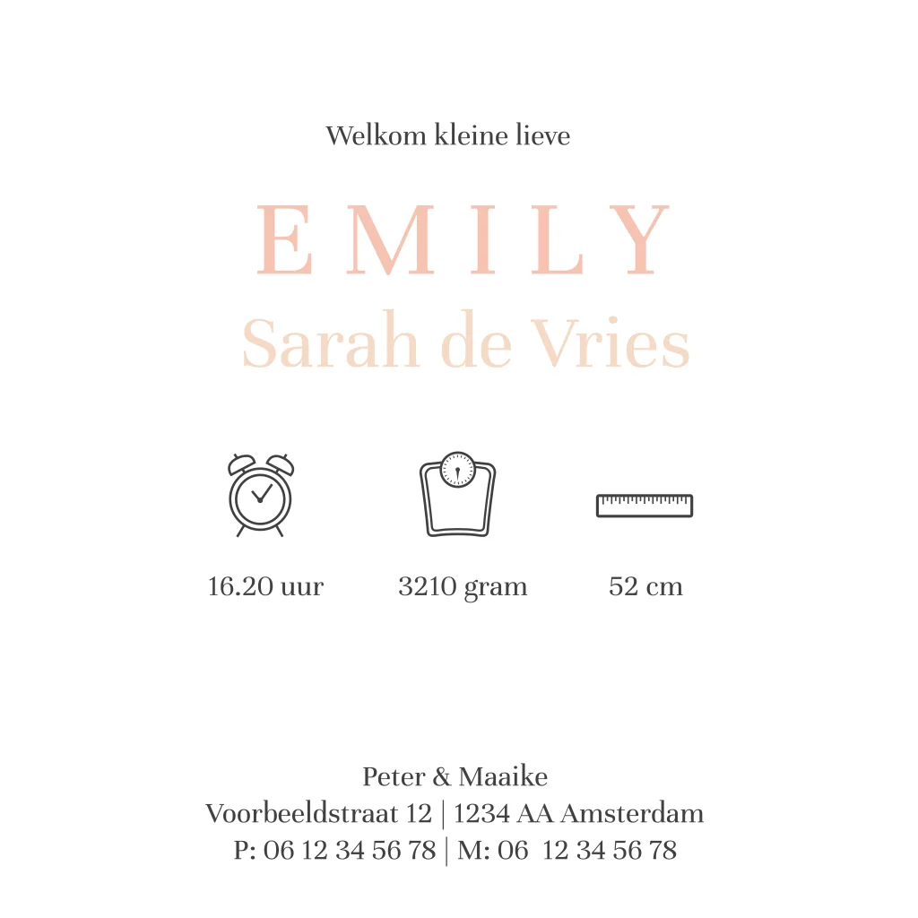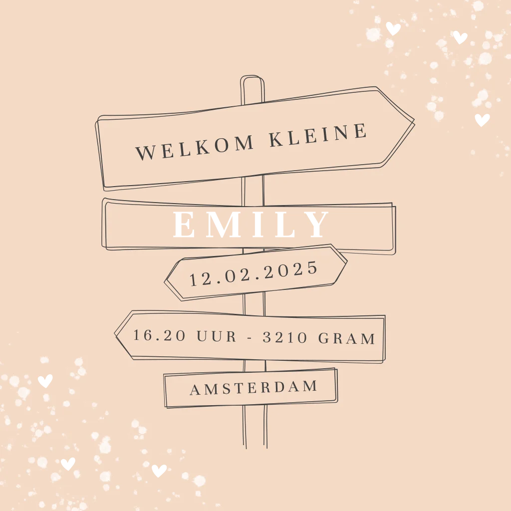 Trendy roségoudfolie geboortekaartje voor de geboorte van je dochter met getekende wegwijzers op een peach-kleurige achtergrond.