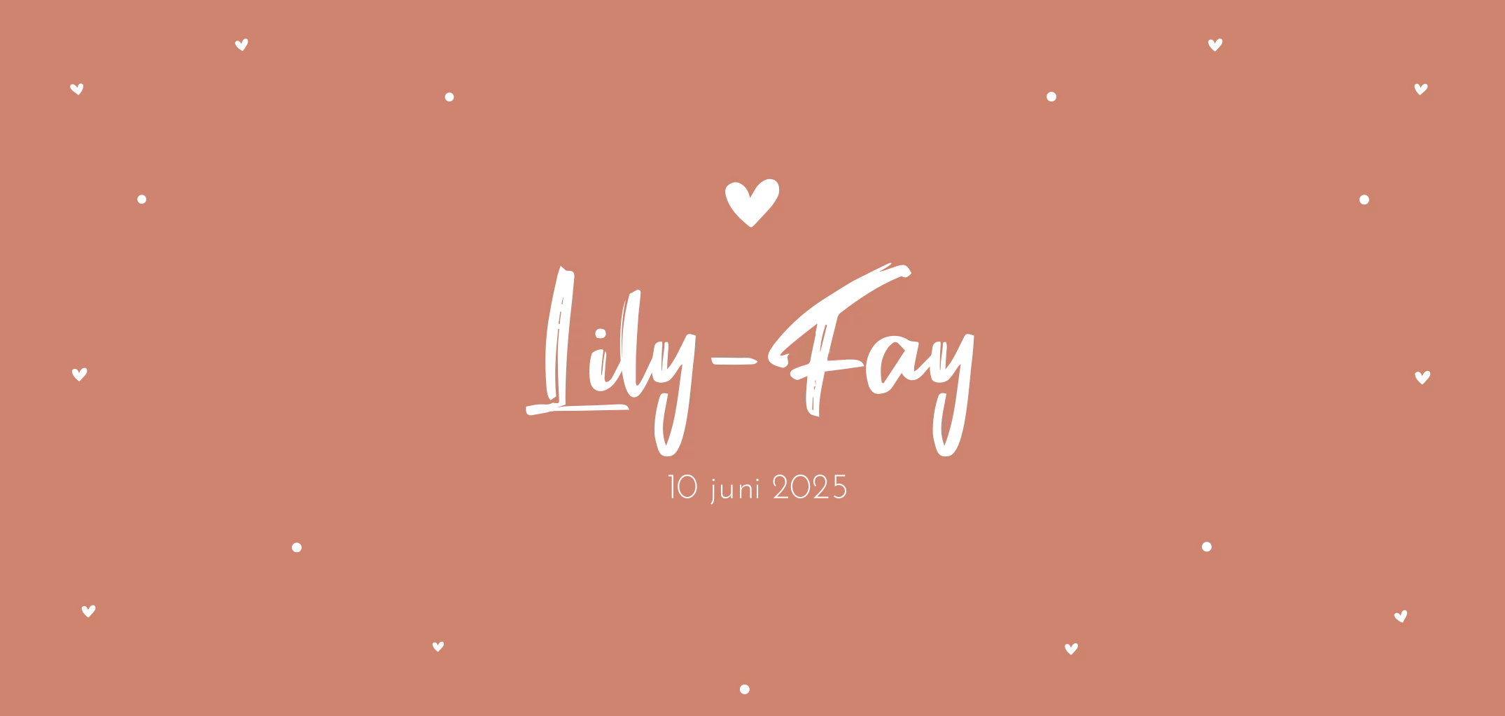Een trendy panorama geboortekaartje met een terracotta achtergrond. Er zijn hier en daar wat kleine hartjes en stippen toegevoegd. Ook boven de naam, die geschreven is in een sierlijk lettertype, staat een klein hartje. Het roségoudfolie zorgt voor een luxe uitstraling.