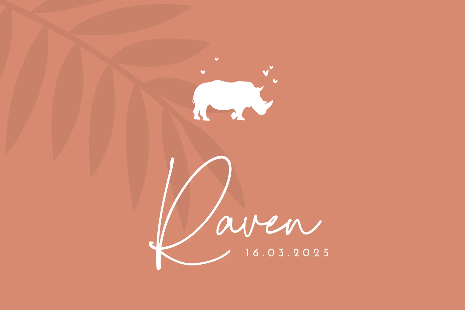Een prachtig kaartje voor de geboorte van jullie dochtertje. De warme kleur op de achtergrond maakt het fijn om naar te kijken. Ook zijn er wat mooie bladeren op de achtergrond toegevoegd. Boven de sierlijk geschreven naam staat een silhouetje van een lief neushoorntje.