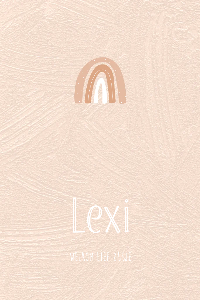 Stoer roségoudfolie geboortekaartje voor een meisje met een trendy regenboogje in natuurlijke kleuren, op een achtergrond met de textuur van verf.