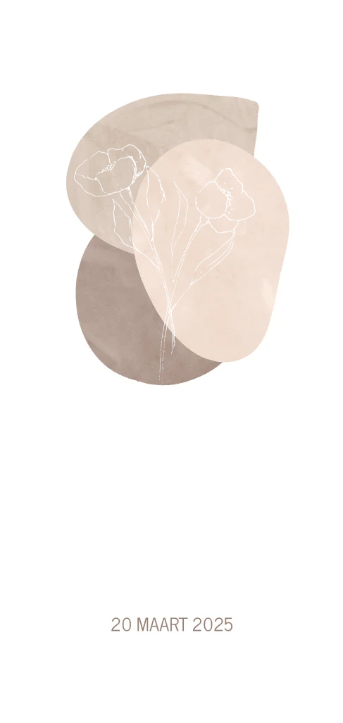 Lief geboortekaartje voor jullie dochter met organische vormen in aardetinten, en bloemetjes en hartjes in roségoudfolie.