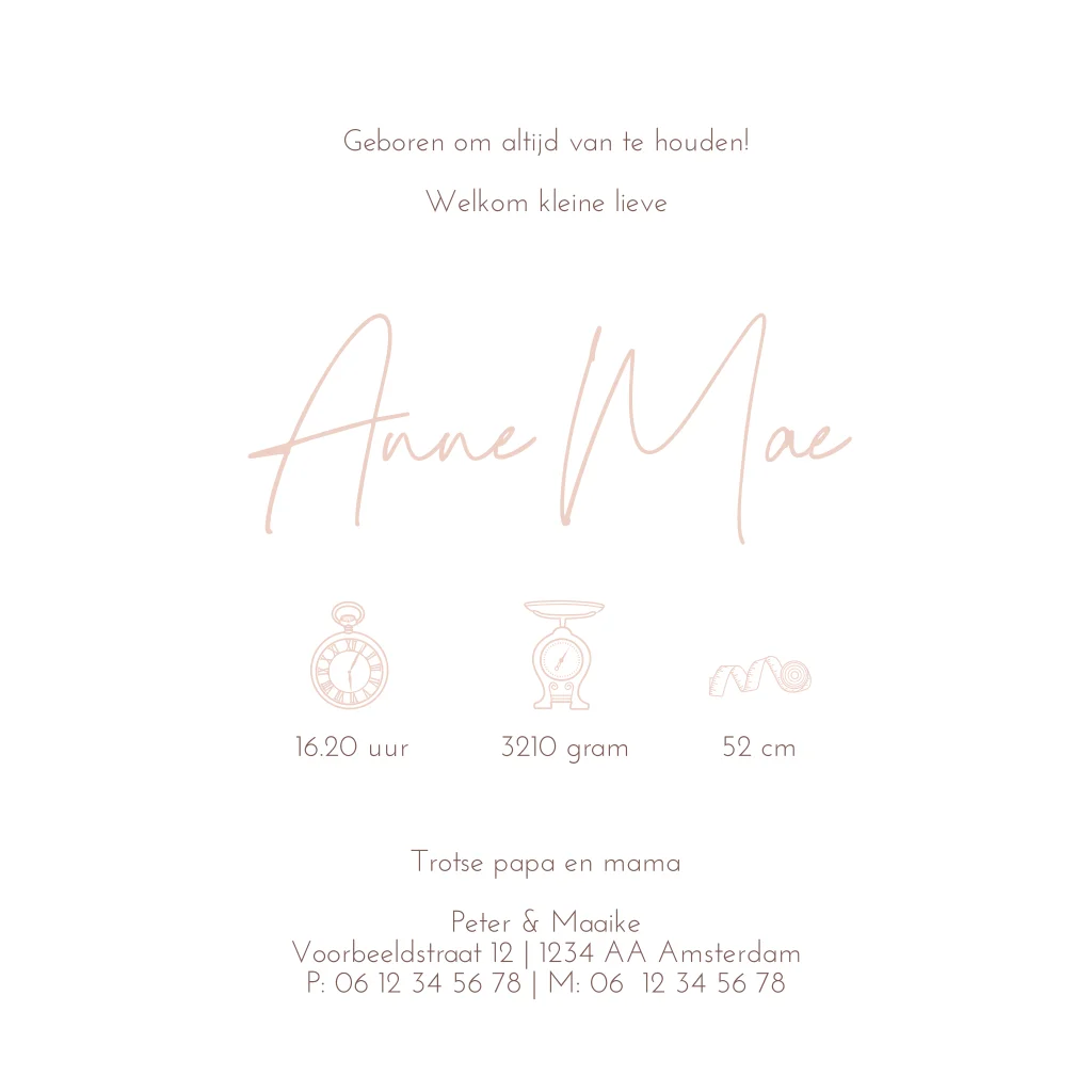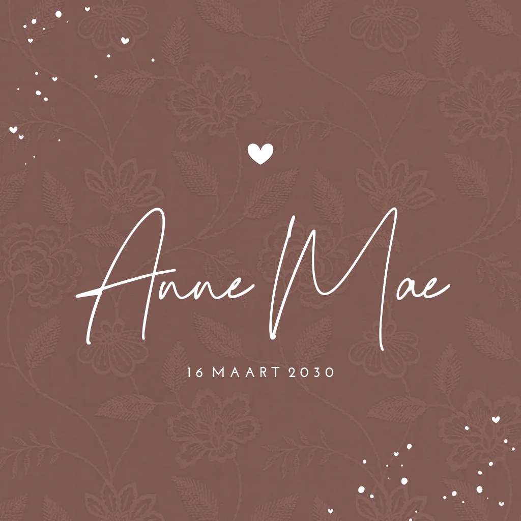 Dit is een stijlvol kaartje voor jullie pasgeboren dochter. Het kaartje heeft een bruine achtergrond met bloemenpatroon en stof-look. Dit staat prachtig in combinatie met de roségoudfolie opdruk. Het kaartje is naar wens aan te passen in onze online editor. Bestel snel een proefdruk om dit kaartje in het echt te bewonderen!