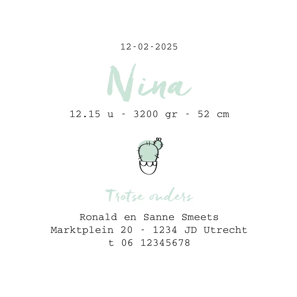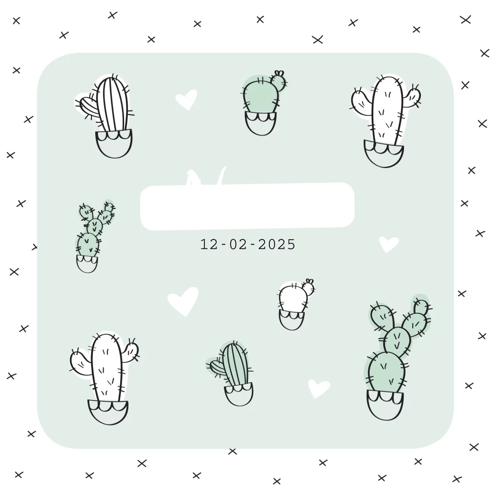 Origineel roségoudfolie geboortekaartje voor je dochtertje met vrolijke illustraties van cactusjes op mintgroen.