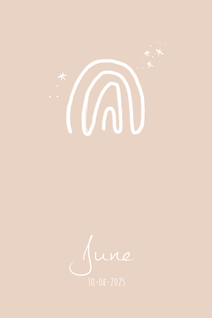 Natuurlijk geboortekaartje met roségoudfolie voor je pasgeboren dochter met trendy lijntekening van een regenboog met sterretjes op zacht roze.