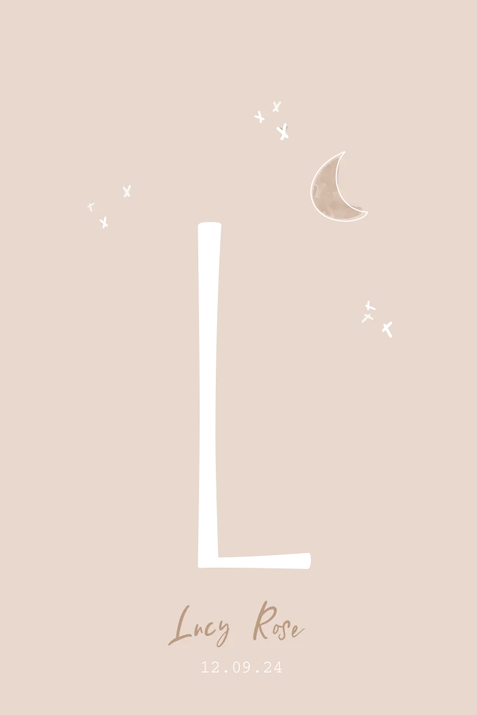 Stijlvol geboortekaartje met roségoudfolie voor je dochter met een hip maantje en sterretjes en de hoofdletter van de babynaam in roségoudfolie op een oudroze achtergrond.