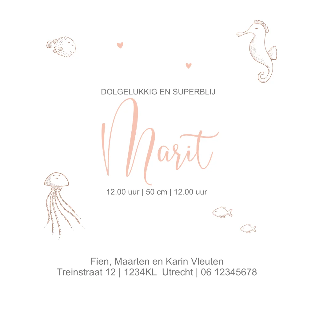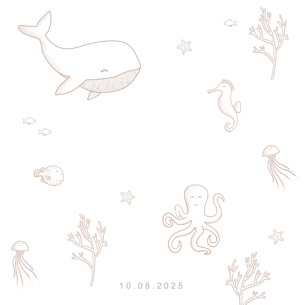 Trendy roségoudfolie geboortekaartje voor de geboorteaankondiging van je dochtertje met hippe lijntekeningen van waterdieren zoals een walvis, een octopus, een kwal en een zeepaardje.