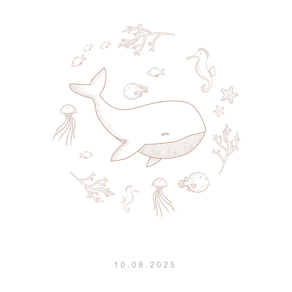 Hippe geboortekaart voor je dochter met mooie pentekeningen van zeedieren zoals een walvis, zeepaardje, kwal en visjes op een witte achtergrond. De roségoudfolie hartjes en babynaam maakt dit echt een stijlvol geboortekaartje!