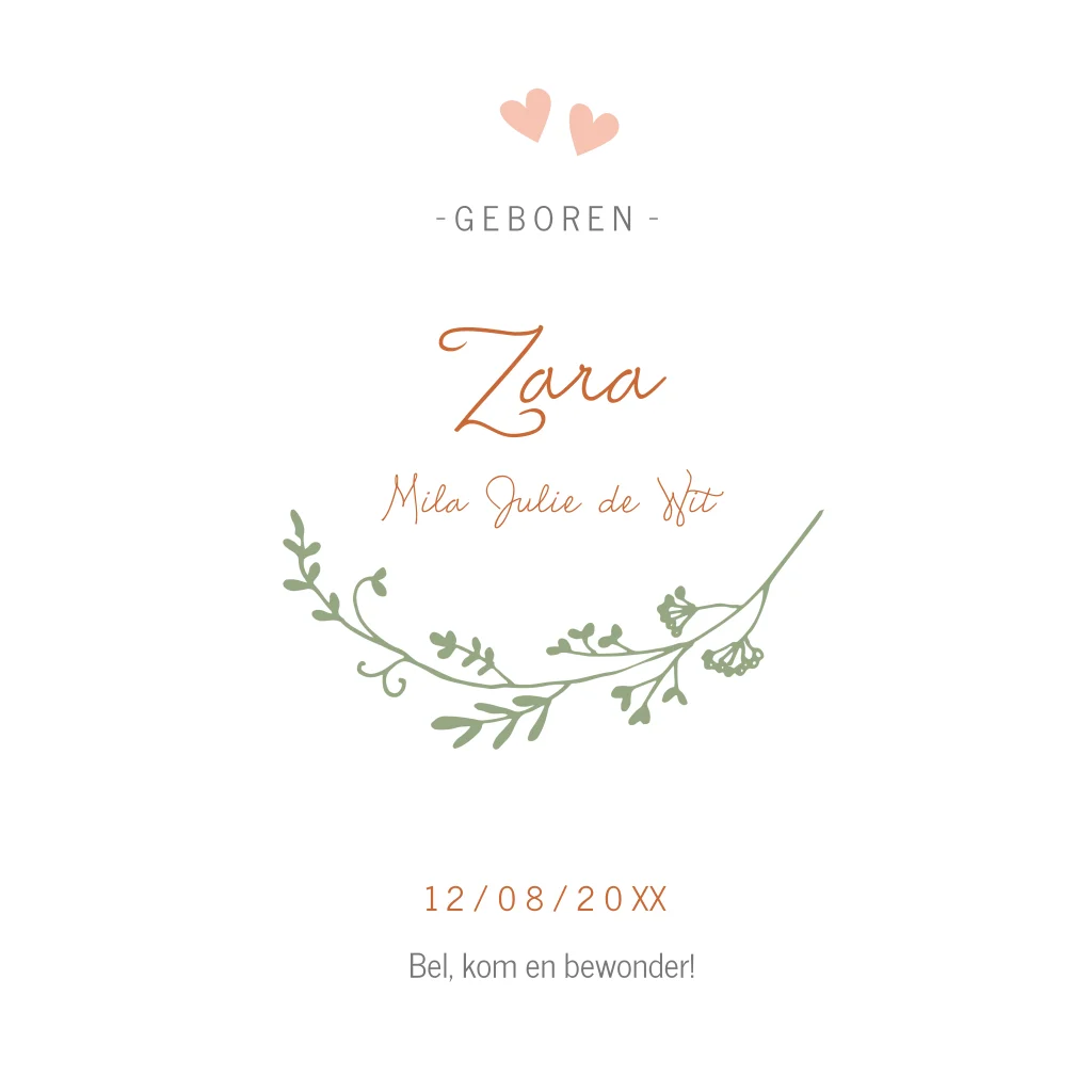 Schattig meisjes geboortekaartje voor je pasgeboren dochtertje met roségoudfolie babynaam en hartjes in een groene krans op een stipjes achtergrond.