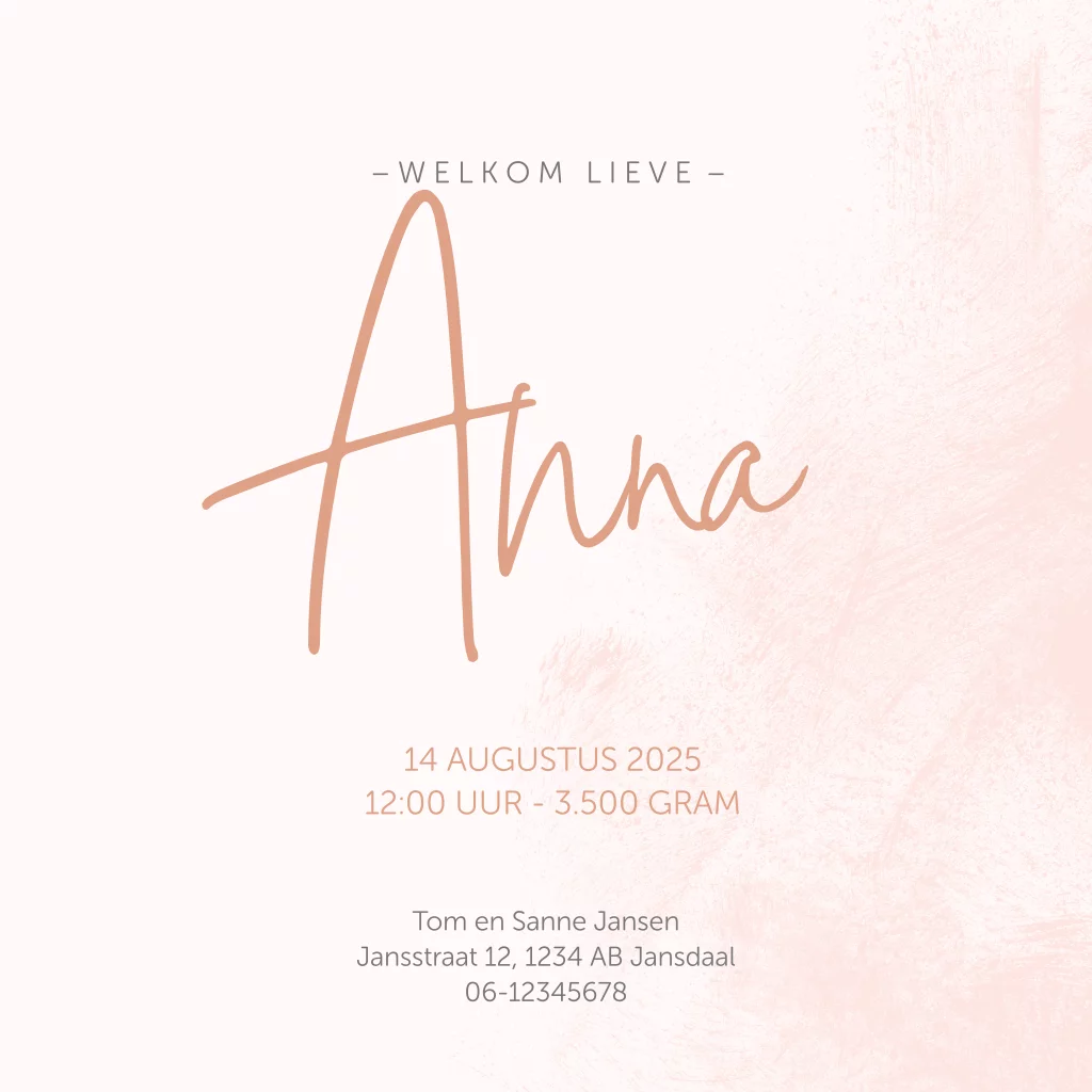 Hip roségoudfolie geboortekaartje voor meisje met roze aquarel