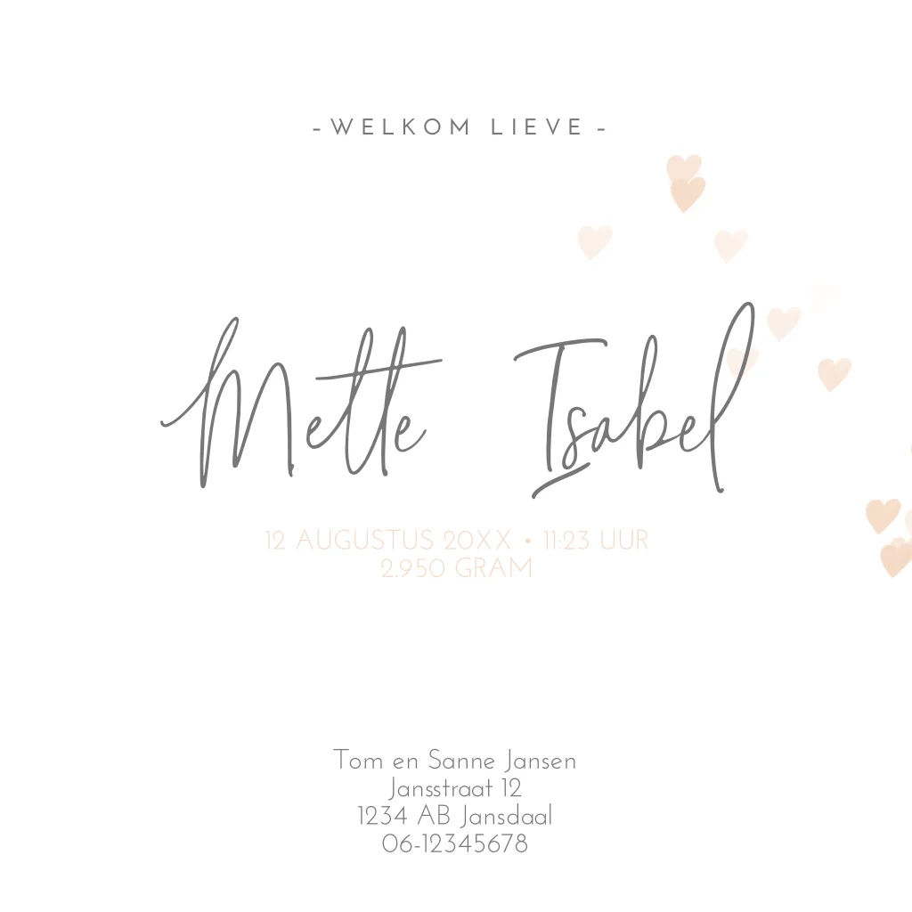 Een lief geboortekaartje met veel roségoudfolie hartjes. In onze online editor kan je dit kaartje volledig naar wens aanpassen.