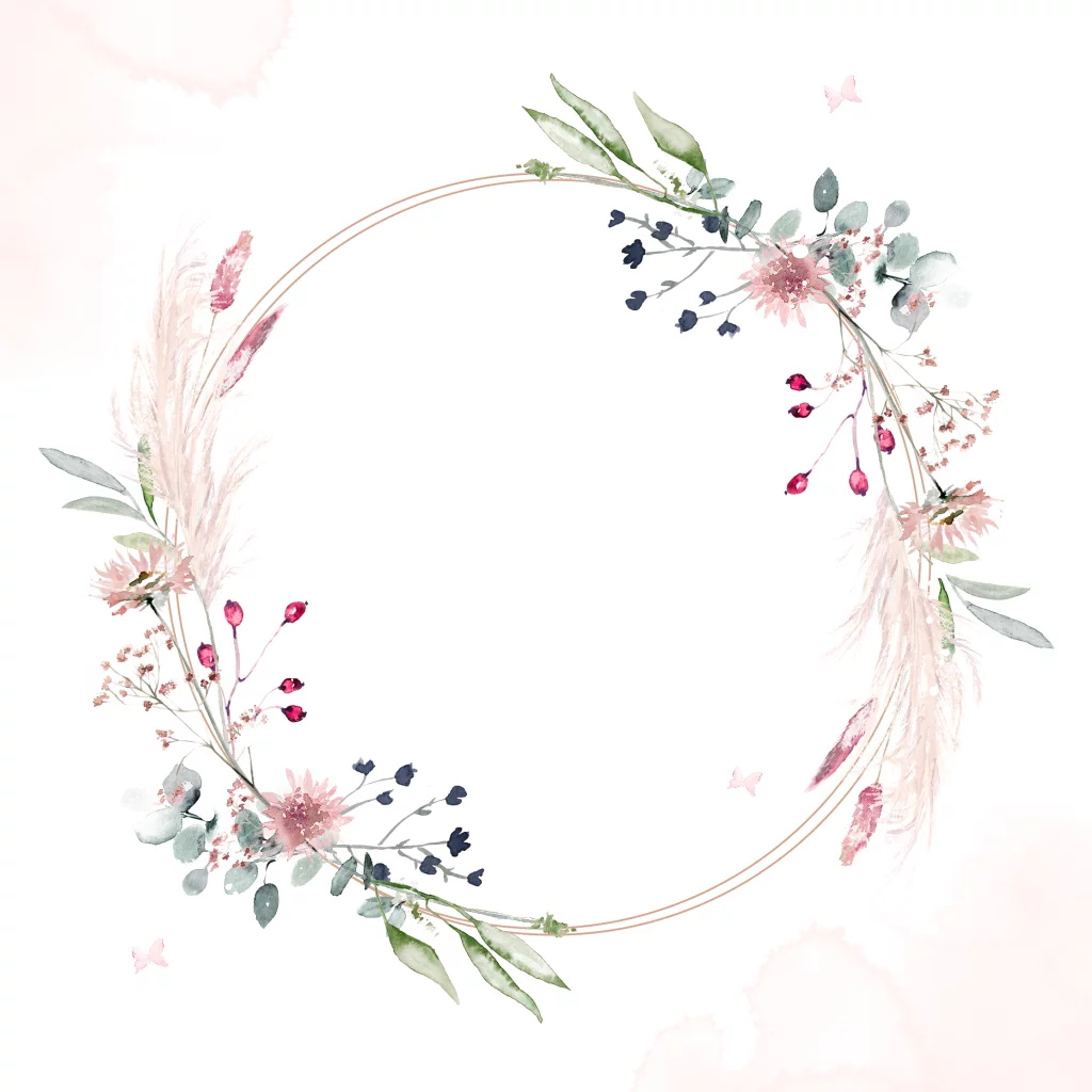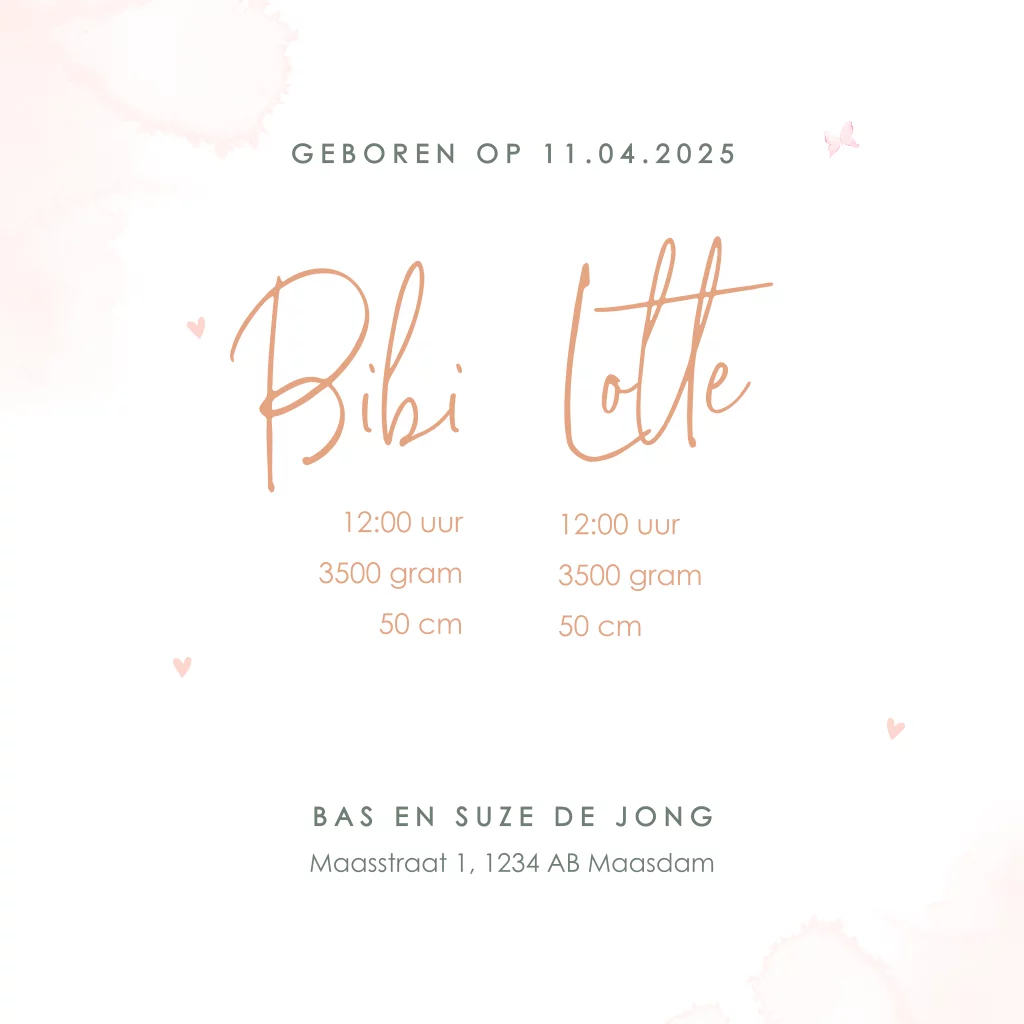 Dit stijlvolle geboortekaartje met bloemenkrans is prachtig voor een meisjes tweeling. De namen zijn geschreven in roségoudfolie. Pas het kaartje helemaal naar wens aan.