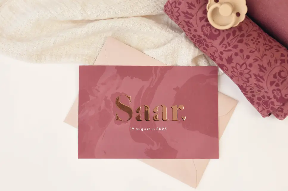 Een trend geboortekaartje voor een meisje. Het kaartje heeft een mooie diepe rood/roze kleur. Het kaartje krijgt een echt luxe uitstraling door de roségoudfolie letters. #michelle