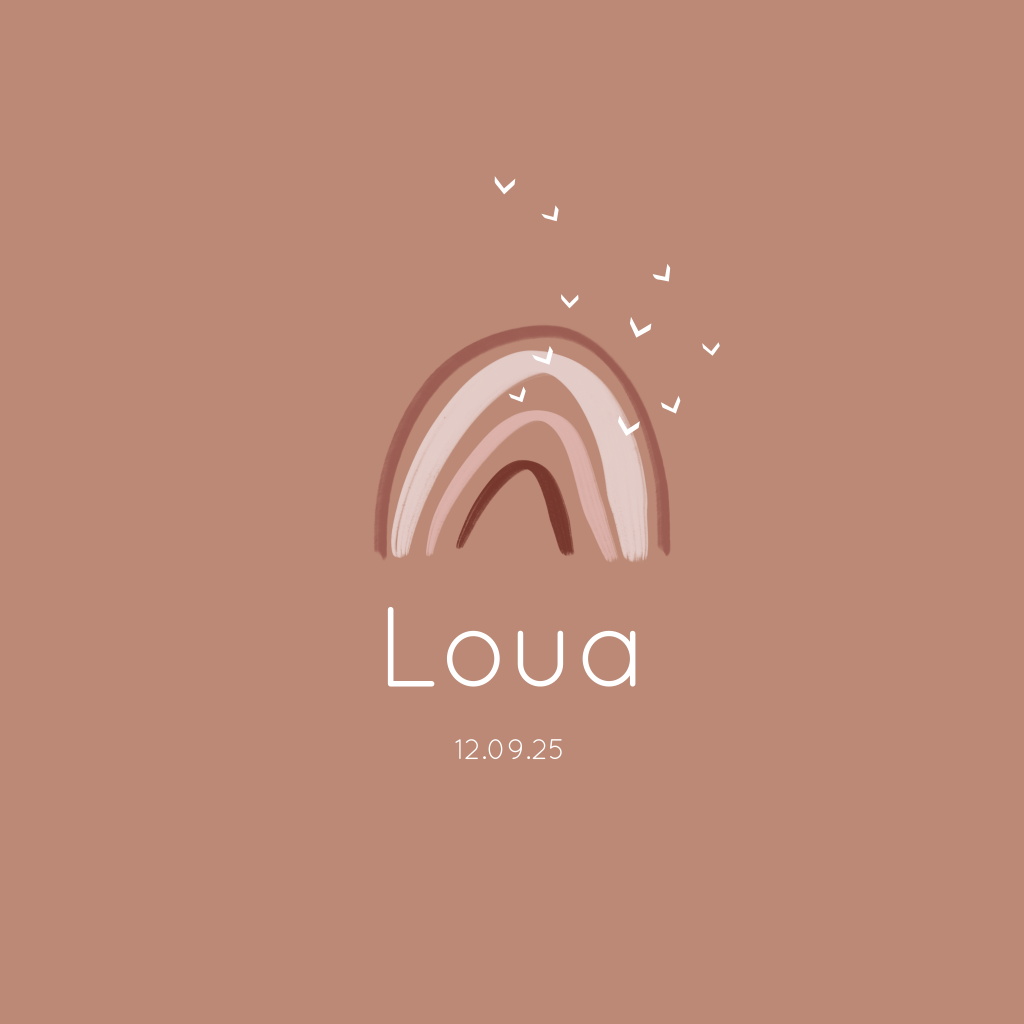 Een trendy en natuurlijk geboortekaartje voor een meisje. Het kaartje is versierd met een trendy regenboogje en goudfolie vogeltjes. Personaliseer dit kaartje in onze online editor.