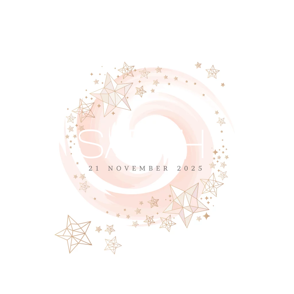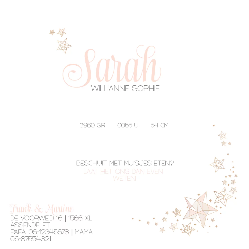 Stoere geboortekaart met zilverfolie en geometrische sterretjes op een zacht roze achtergrond.