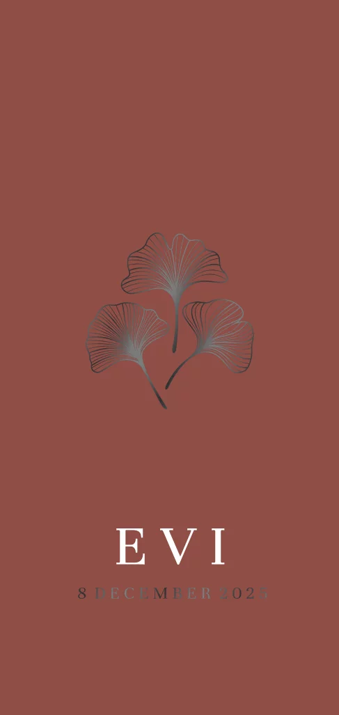 Een klassiek en rustig geboortekaartje voor jullie dochtertje. De donkerrode achtergrond en de ginkgo bladeren geven het kaartje een unieke touch. Het zwart folie maakt het helemaal af.
