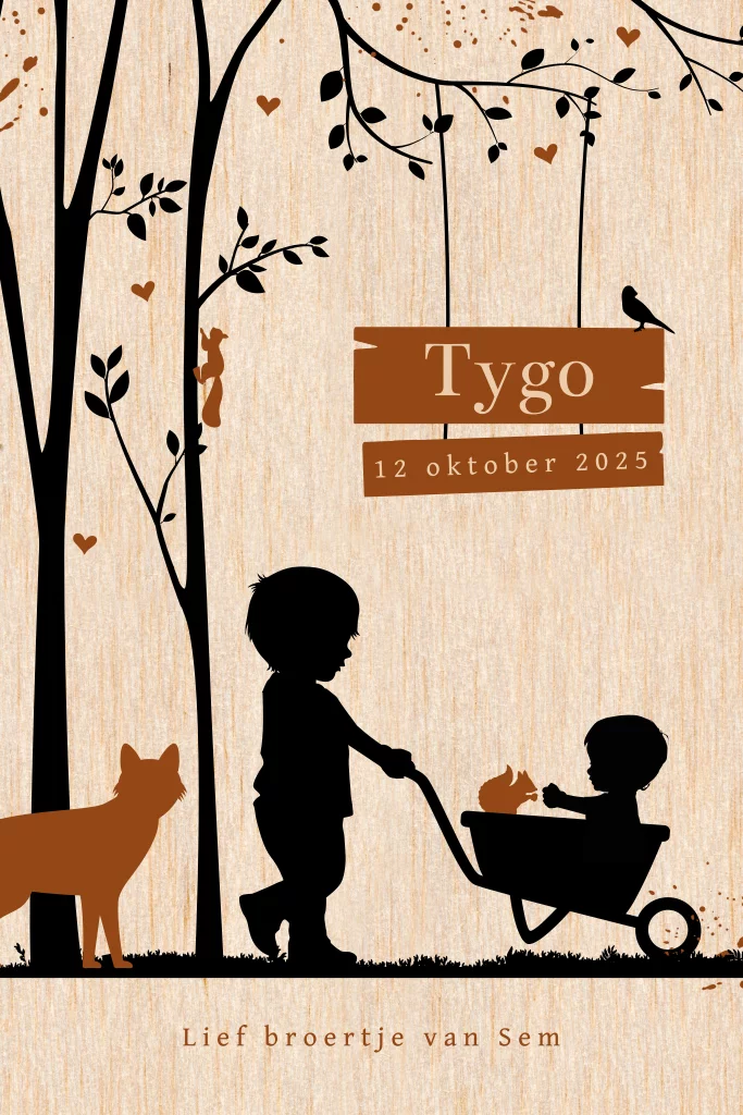 Hip, echt houten geboortekaartje voor een jongen met silhouet van een broer en zijn broertje in een kruiwagen, een boom en een vos. Bewerk naar smaak in de online editor.