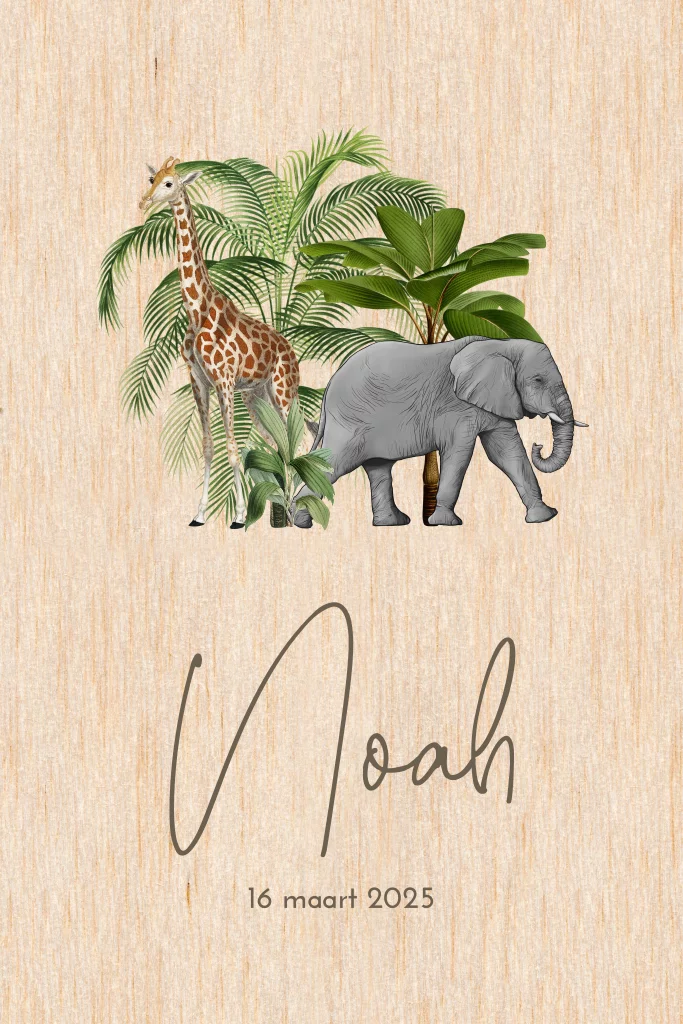 Babykaartje van echt berkenhout voor jullie toekomstige zoon. Op dit kaartje zijn een giraf en een olifant te zien in een jungle.
