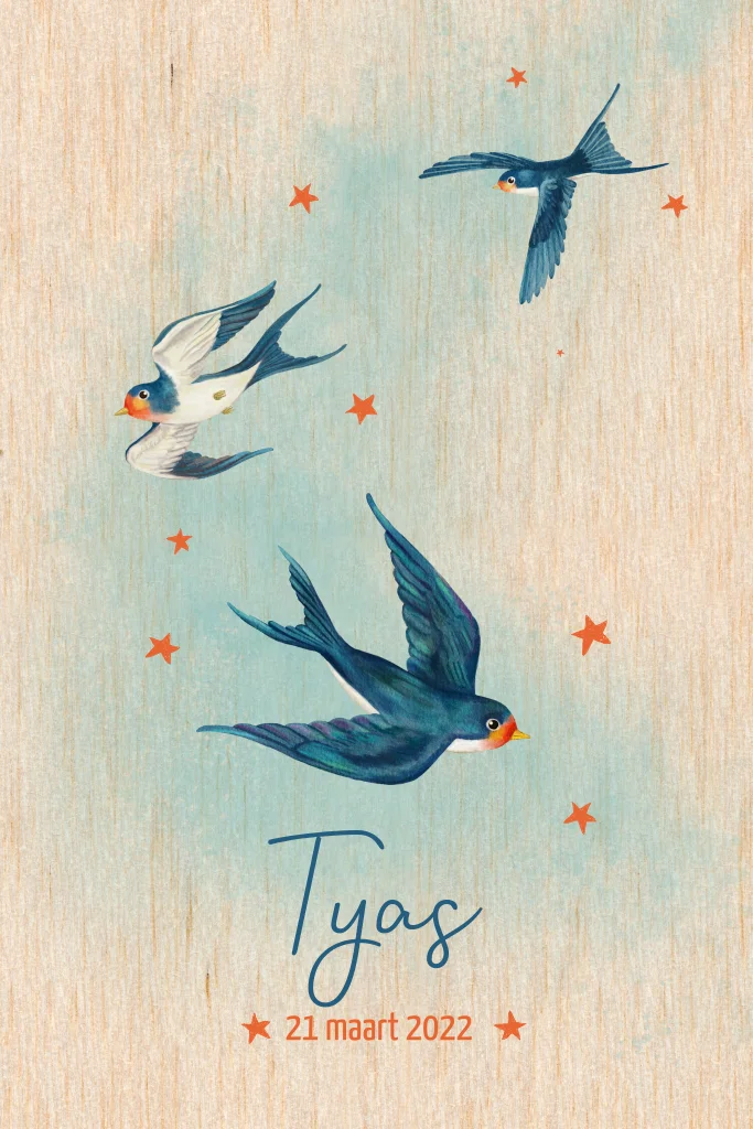 Fris geboortekaartje met vliegende vogels en oranje sterretjes. Dit design wordt gedrukt op echt berkenhout. Dit maakt het ontzettend uniek. Ook de ronde hoeken zijn erg gaaf!| Totaalprijs: 0 |