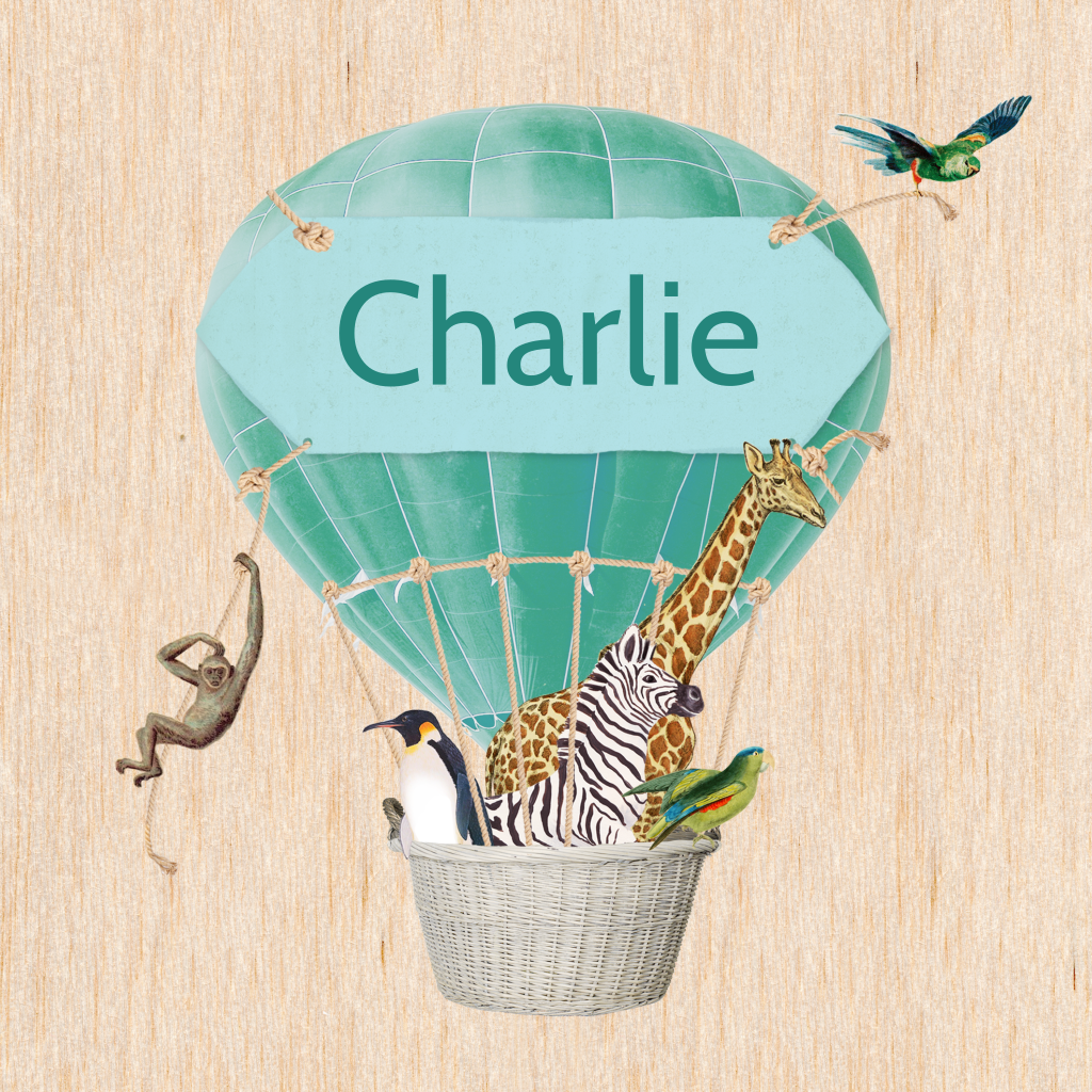 Hip houten kaartje met een passende illustratie van dieren in een mintgroene luchtballon. Dit kaartje heeft ook nog eens unieke ronde hoeken. Dieren die te zien zijn op deze geboortekaart zijn: een giraffe, een zebra, een pinguïn en een aap.