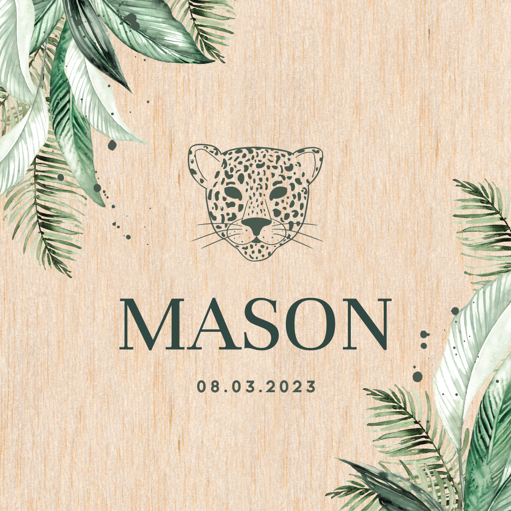 Geboortekaartje van echt hout voor zoon met panterprint en bladeren