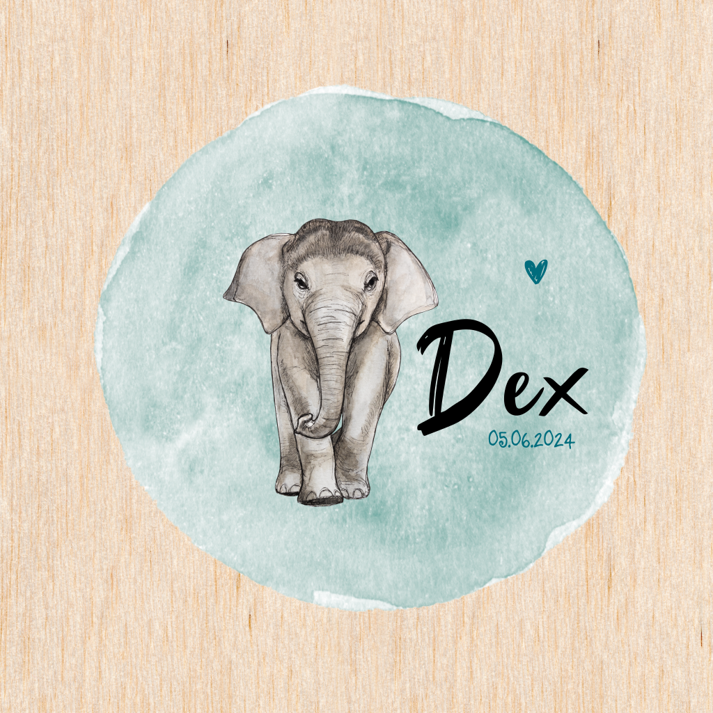 Een staand houten geboortekaartje voor een jongen met een schattige olifantje op blauwe watercolor. Je kunt het geboortekaartje naar wens aanpassen.