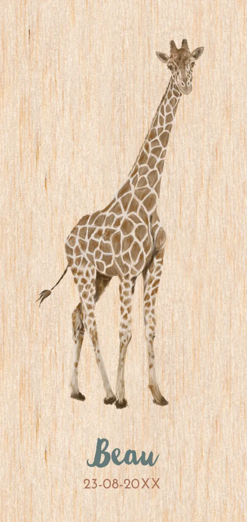 Geboortekaart van hout unisex, met een hand getekende giraf. Super mooie houten kaart voor een avontuurlijk kindje, want grote avonturen beginnen klein! Deze kaart is een echte eye catcher als je hem binnenkrijgt.