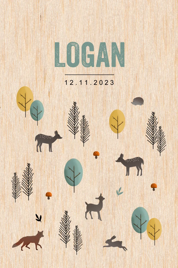 Echt houten staand geboortekaartje met diverse bosdieren en bomen.