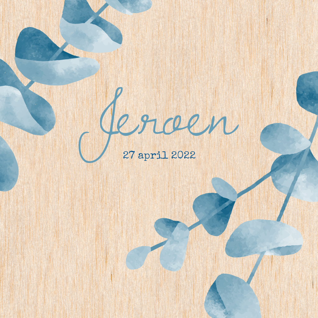 Wat een mooie kleurencombinatie is dit! Natuurlijk vormgegeven Eucalyptus takjes op een een echt houten geboortekaartje.