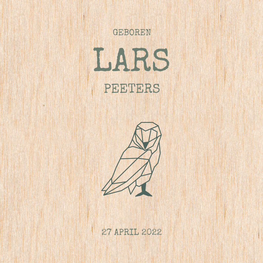 Gemaakt van écht hout is dit stoere geboortekaartje, de geometrische uil introduceert jullie zoontje op een toffe manier.