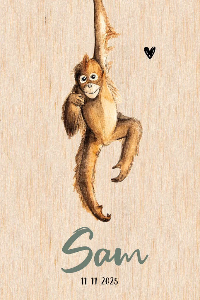 Lief babykaartje met de illustratie van een aapje hangend aan zijn arm. Dit kaartje is leuk voor een jongen of meisje. Pas de teksten en kleuren eenvoudig aan en maak zo je eigen unieke kaartje!