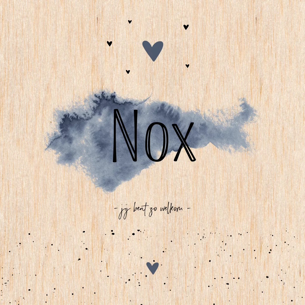 Trendy geboortekaartje voor een jongen van echt hout, met blauwe watercolour spatten en hartjes.