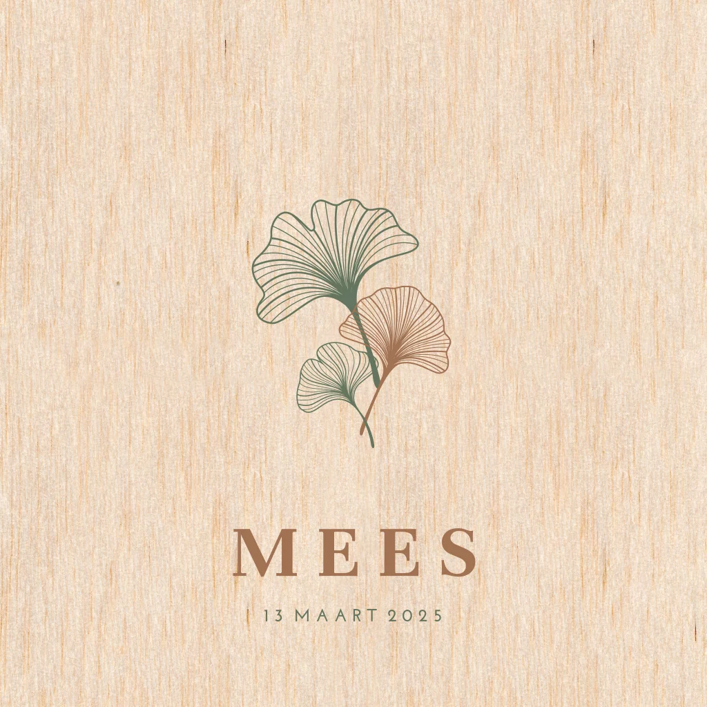 Stijlvol geboortekaartje op echt hout voor jongen met ginkgo bladeren