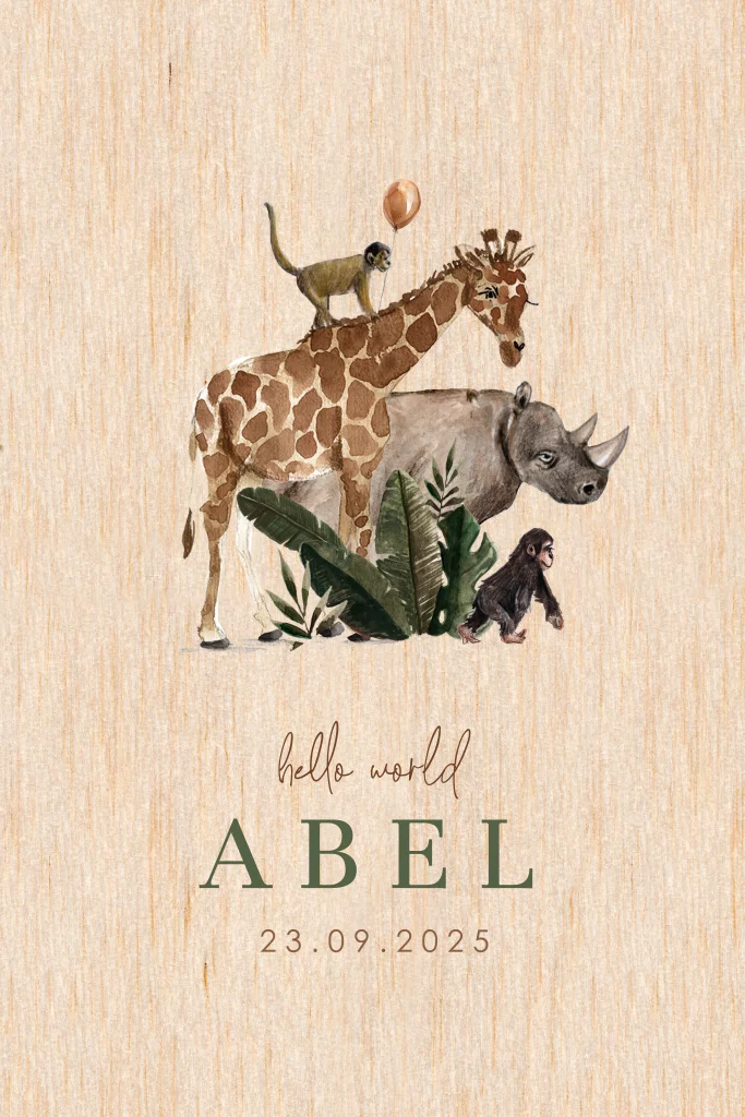 Op zoek naar een mooi, natuurlijk kaartje voor de geboorte van jullie kindje? Op dit unieke kaartje met een jungle thema zie je een giraf, een neushoorn en vrolijke aapjes. De bovenste aap heeft een ballon vast.