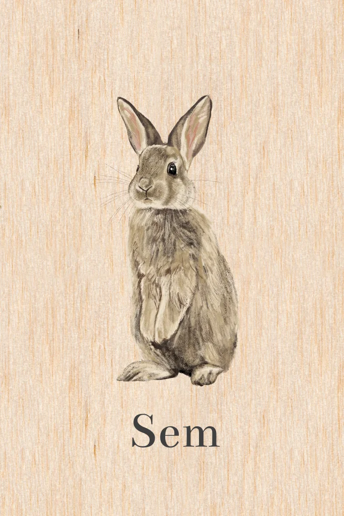 Lief geboortekaartje met illustratie van een schattig konijntje. Dit kaartje wordt gedrukt op echt hout en is daarmee extra bijzonder!