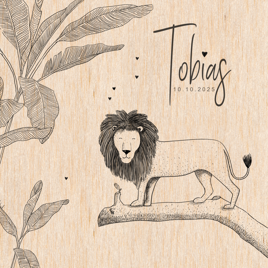 Dit echt houten geboortekaartje met de tekening van een leeuw en jungle bladeren is super stoer! Het leeuwtje staat op een boomstam. De kleine hartjes geven het kaartje een zachte uitstraling. Kies in onze online editor een lettertype en pas de persoonlijke informatie aan.