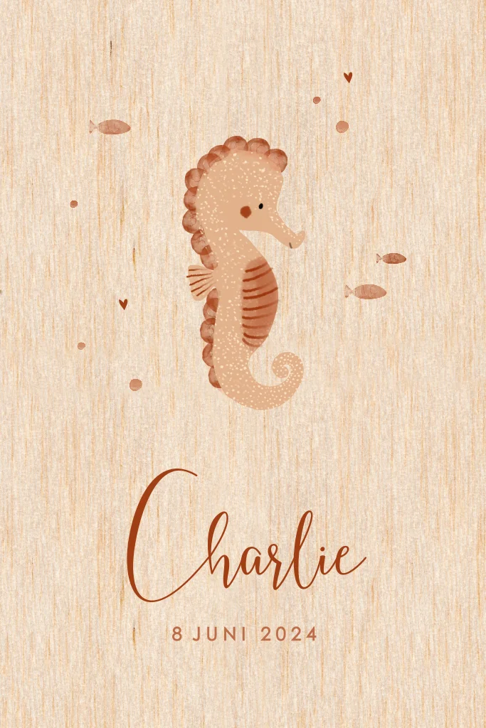 Dit geboortekaartje past bij het thema onderwaterwereld. Met de illustratie van een lief zeepaardje, kleine visjes, hartjes en bellen.