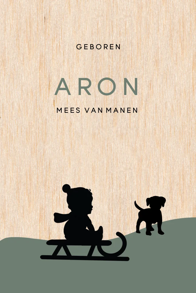 Echt houten geboortekaartje met silhouet van jongetje op slee