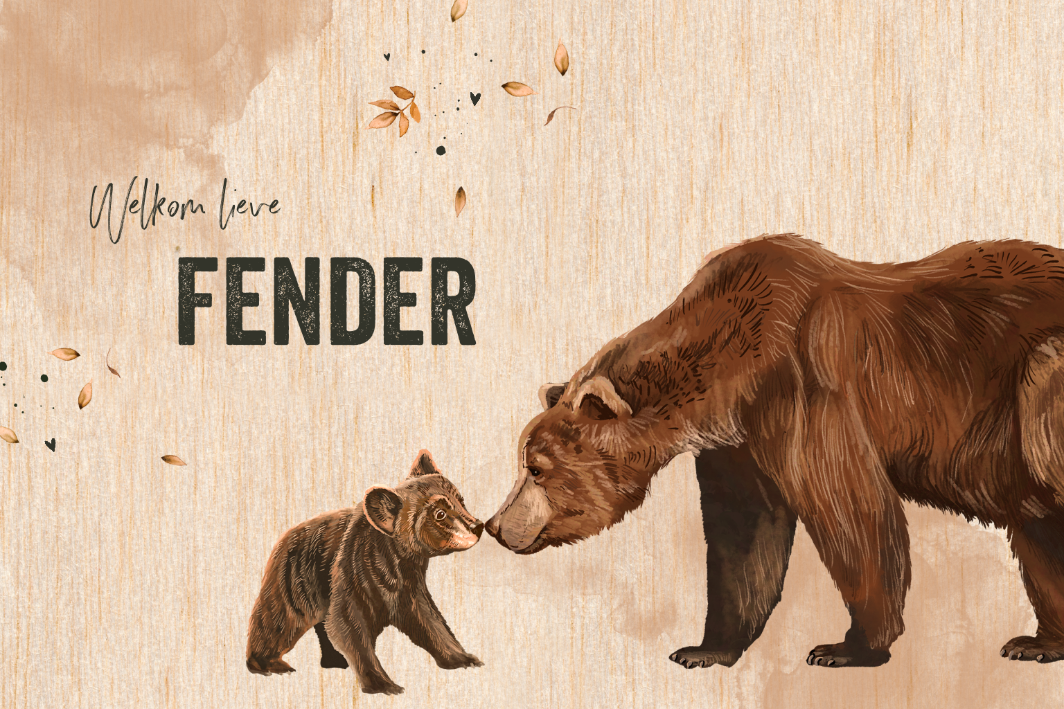 Stoer geboortekaartje op echt hout met beren en blaadjes