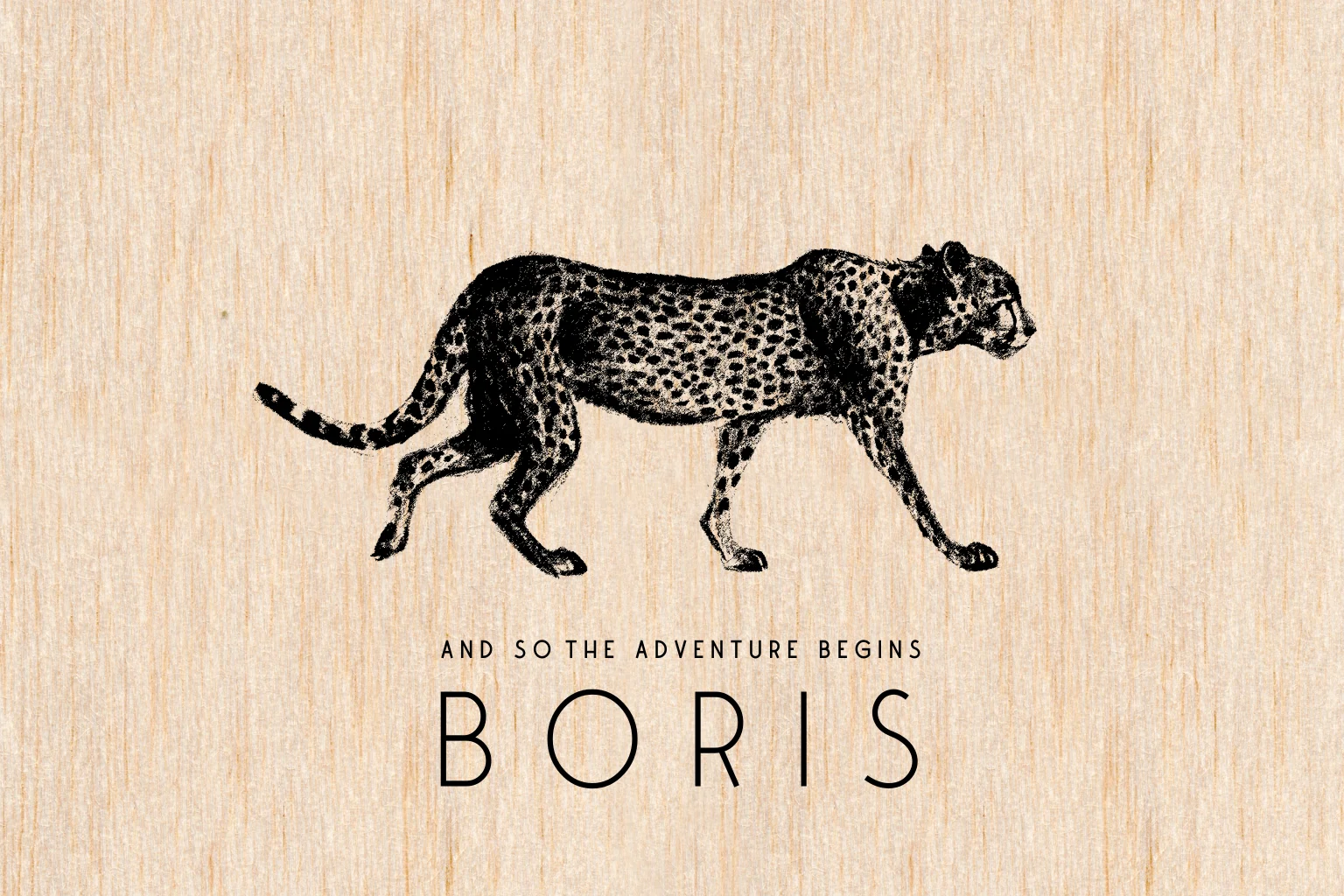 Dit unieke babykaartje met handgetekende illustratie van een luipaard is extra stoer omdat het gedrukt wordt op echt hout! Op de achterkant van het kaartje staan palm bladeren. De teksten op het kaartje en de kleur van de luipaard kan je naar wens aanpassen in de online editor.