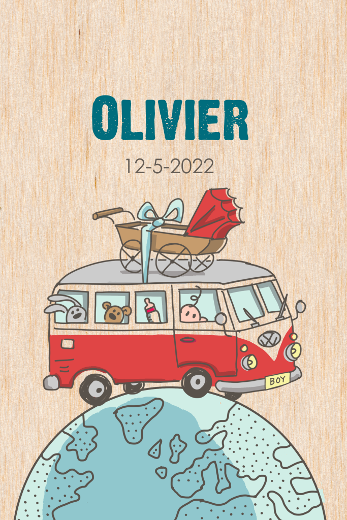 Vintage volkswagen busje met daarin een jongen en zijn knuffels rijdend over de wereld. Bovenop het dak van het rode busje staat een kinderwagen. Op de nummerplaat het woord boy.Totaalprijs: 0 |